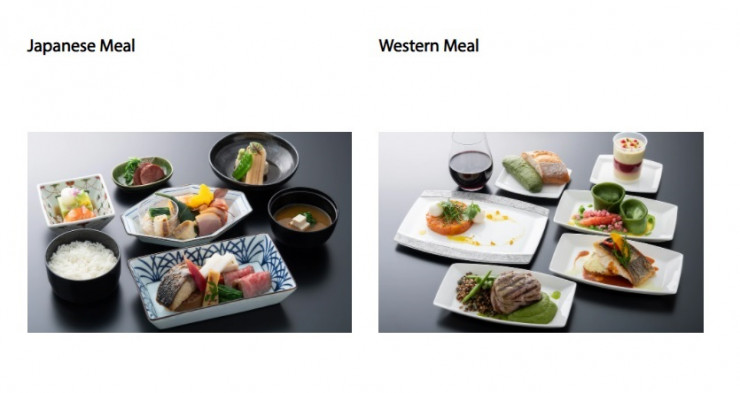 Пассажиры могут выбрать блюда в японском или западном стиле, которые авиакомпания обычно предоставляет в салонах первого класса и бизнес-класса.