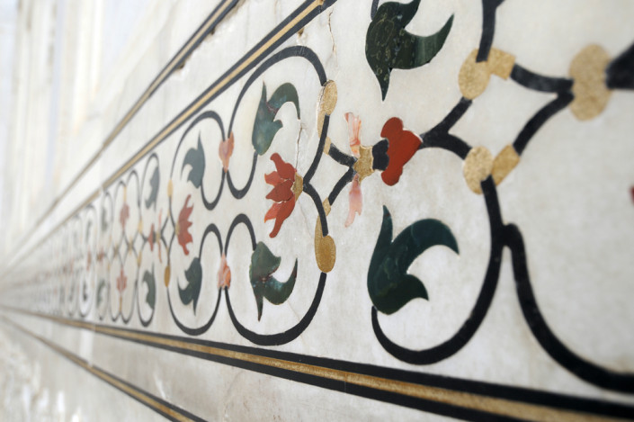 Стены Тадж-Махала, как внутри, так и снаружи, украшены красивой мозаикой, расписаны тонкими узорами и витиеватыми орнаментами.