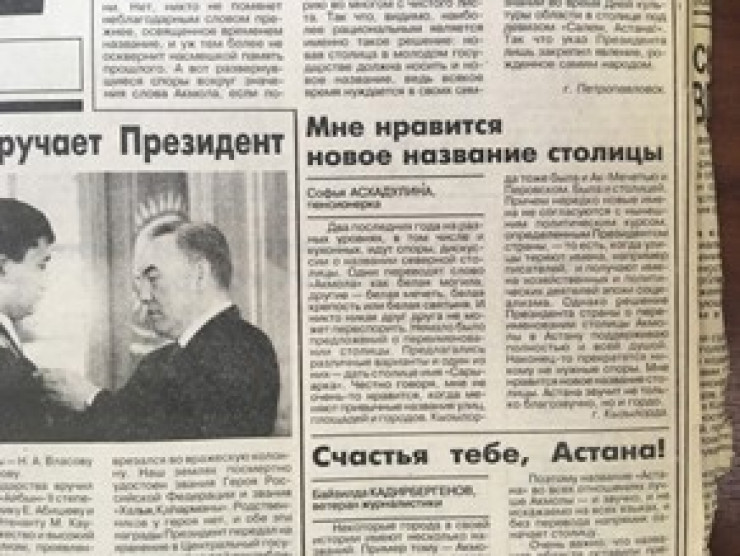 "Помню, как в 1998 году по дороге из аэропорта я предложил назвать столицу "Астана". Вечером в резиденции разговор продолжился. Аргументы за "Астану" я привел весомые: слово имеет четко фиксированный смысл, оно означает "столица"; во-вторых, оно не обременено какими бы то ни было негативными политическими или историческими интерпретациями; в-третьих, оно точно отражает функции города, благозвучно как на государственном, так и на других языках, и, наконец, оно может стать символом города во время презентации столицы, которая войдет в мировой список главных городов государств уже с новым именем", – вспоминает Нурсултан Назарбаев в книге "Эра независимости".