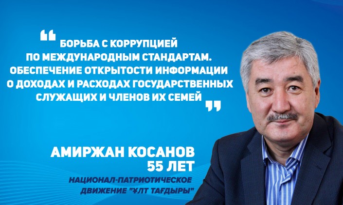 "Вернуть системе государственной службы, национальным компаниям, сфере образования и медицины принципы прозрачности и ответственности. В кадровой политике исключить протекционизм и коррупцию, открыть дорогу профессионализму и компетентности", - говорится в предвыборной программе Амиржана Косанова.