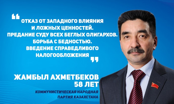 Жамбыл Ахметбеков - кандидат в президенты от Коммунистической Народной партии Казахстана. Он уроженец Целиноградской области. Женат, воспитывает четырех дочерей. Является обладателем черного пояса первого дана по карате. Жамбыл Ахметбеков депутат Мажилиса Парламента VI созыва. В 2011 году участвовал в выборах президента Казахстана и набрал тогда 1,36 процента голосов избирателей.