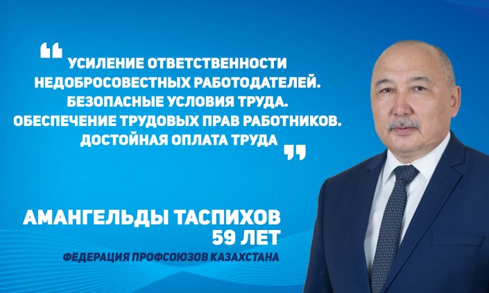 Амангельды Таспихов - кандидат в президенты от Федерации профсоюзов Казахстана. Он уроженец Западно-Казахстанской области. У него двое детей. По специальности - инженер-механик. В разные годы занимал руководящие должности на госслужбе, работал в бизнес-структурах. Избирался депутатом маслихата Западно-Казахстанской области и депутатом Сената и Мажилиса.