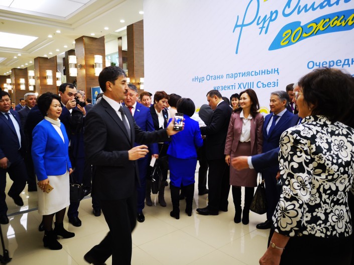 У делегатов съезда "Нур Отан" в распоряжении было более двух часов. Нурсултан Назарбаев должен был прибыть лишь к 11 утра. Ближе к 9:00 холл Дворца Независимости постепенно наполняли нуротановцы из всех регионов страны. Что они делали? А что еще делать празднично одетым людям? Конечно, фотографироваться. Нужно ли говорить, что в этот юбилейный съезд партии дамы были при параде, да и мужчины были под стать им. Не пропадать же такой красоте.
