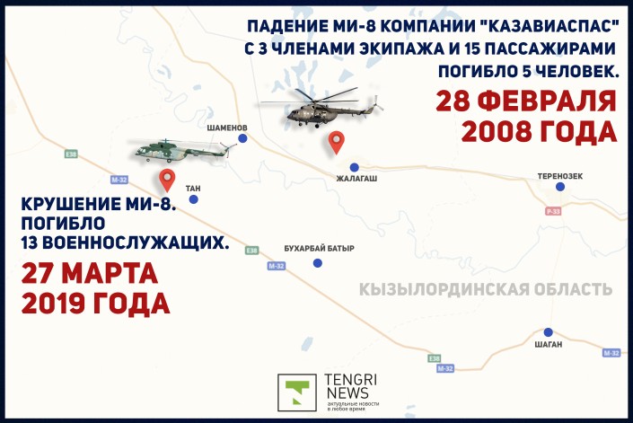 27 марта 2019 года военный вертолет потерпел крушение в Кызылординской области. Вертолет Ми-8 упал в Жалагашском районе. Погибли 13 человек. По роковому стечению обстоятельств в этом же самом районе 11 лет назад разбился еще один Ми-8. 28 февраля 2008 года борт "Казавиаспаса" не долетел до нужной точки. 27 марта и 28 февраля, с разницей в 11 лет, стали печальными датами в истории страны. Редакция Tengrinews.kz предлагает вспомнить детали двух авиакатастроф.