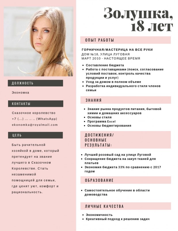 Таким образом, у Золушки получилось бы примерно так: Сказочное Королевство, Золушка, 18 лет, +7 (...) ... .. .., ekonomka@royalpochta.com. К резюме можно прикрепить фотографию.