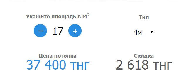 Также можно сделать натяжной потолок. Минимальная цена за квадрат в Астане - от 1500 тенге. Но тут нужно учитывать, что за каждый обход трубы, гардин, установку люстр и софитов нужно платить дополнительно. Для примера я посчитала на сайте одной из фирм сумму на 17 квадратных метров.