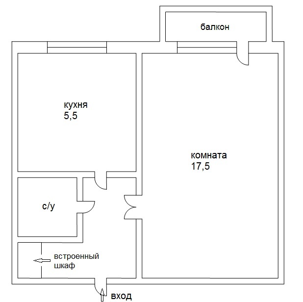 Размеры: окно - 2 * 1,5 метра; дверной проем - 0,9 * 2,1 метра.