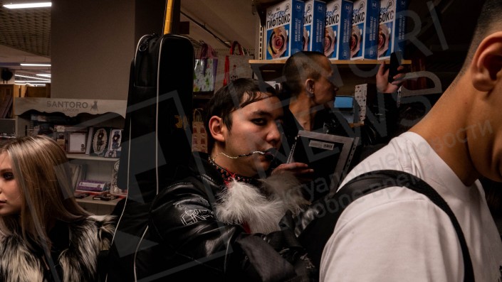 Фоторепортеры и журналисты за 2 часа ожидания, не в пример поклонникам снаружи, несколько приуныли. Коротали время за рассматриванием антуража и полок с новинками в литературе, кино- и игровой индустрии. Ждать приходилось только ради 5 минут съемки...