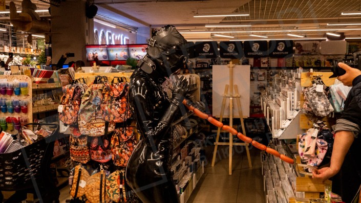 Эпатажный немец появился в зале магазина под аккомпанемент русской оперной музыки. В компании с ним была "латексная женщина", чье лицо полностью скрывала маска. Ее вели на поводке из сосисок.