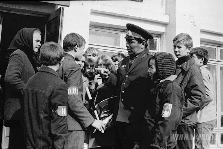 Надпись на конверте к следующим снимкам гласит: "Начальник отделения ГАИ Танабергенов Е. и школьники". Судя по фото, сначала для ребятни провели инструктаж, а после некоторым из них дали попробовать себя в роли регулировщиков.