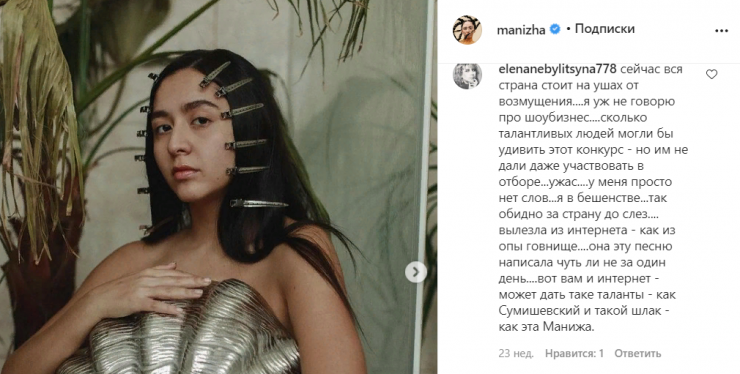 Певицу обвиняли в "искажении образа русской женщины". Некоторые деятели просили Следственный комитет России проверить песню Манижи на наличие признаков возбуждения ненависти или вражды. В какой-то момент девушка перестала проверять сообщения в телефоне.