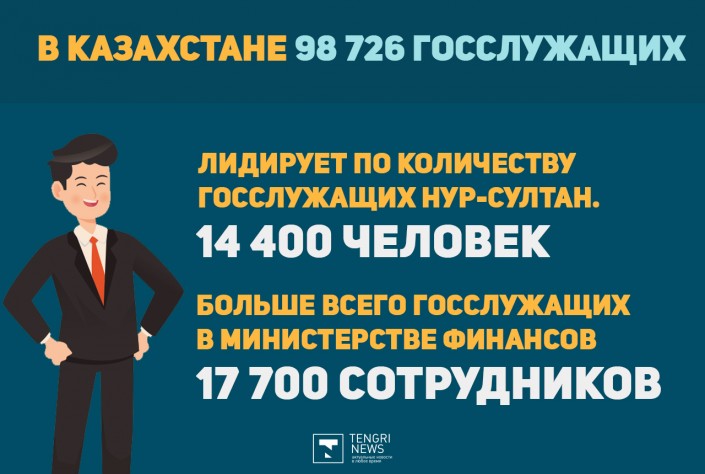 В Казахстане на начало года зарегистрировано 98 726 госслужащих. Наибольшая численность отмечается в Министерстве финансов - 17,7 тысячи сотрудников. Это без учета правоохранительного блока.