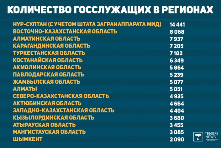 Лидирует по количеству госслужащих Нур-Султан, где трудится 14 441 человек. Меньше всего государственных сотрудников в Шымкенте - 2090 человек. Такие данные нам предоставили в ответе на запрос в Агентстве по делам государственной службы.