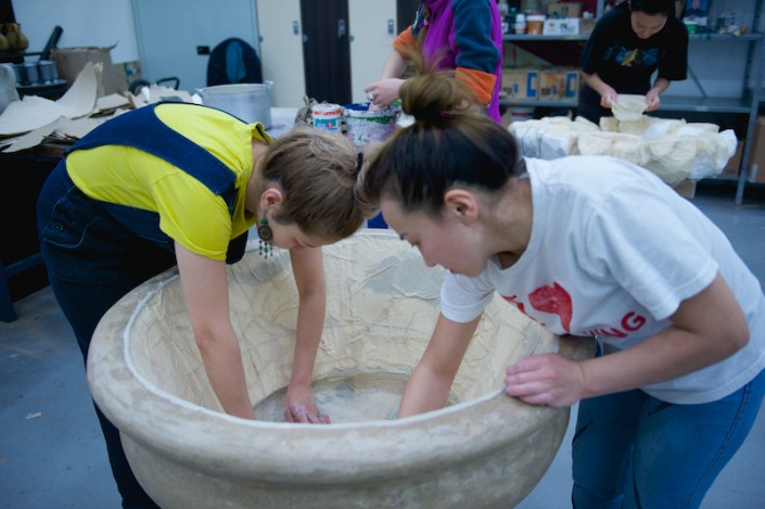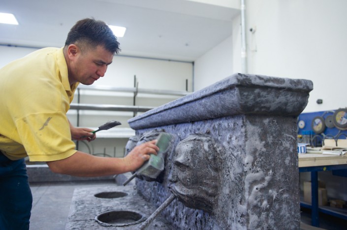 "Необычной формы посуда, кувшины, вазы удивили нас сразу, как только мы увидели эскизы. Изготовлялись они по технологии папье-маше, но вначале отливались формы, вытягивались глиной, затем заливались гипсом, а уже потом лепилось папье-маше, - рассказывает художник-бутафор, скульптор Даурен Омаров. - Бутафорские ружья по технологии изготовления идентичны настоящим: дерево, металл и чеканка, а если добавить специальный механизм, то они смогут даже стрелять. Светильники выполнены из дерева, но так задекорированы, что выглядят, как будто сделаны из старой латуни, с проступившей на железных вставках ржавчиной".