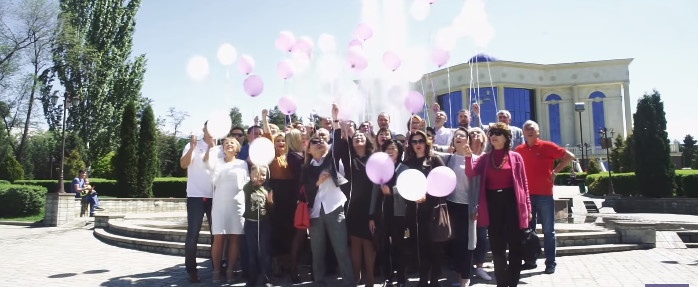 Вот мужчина солидных лет говорит об огромных возможностях, которые дает эта компания. Разрезается торт, а потом счастливые люди в один голос произносят: "Алматы, Альфа кэш!" В небо летят узнаваемые воздушные шары.