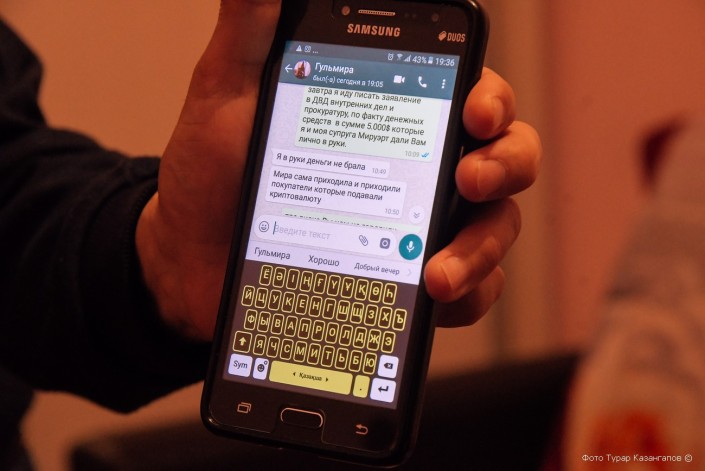 Супруги говорят, что собственноручно отнесли 5 000 долларов некой Гульмире. На днях Бакыт, не зная, где найти правду, написал Гульмире сообщение, в котором намекнул на то, что будет обращаться в правоохранительные органы. Женщина ответила, что никаких денег в руки не брала.