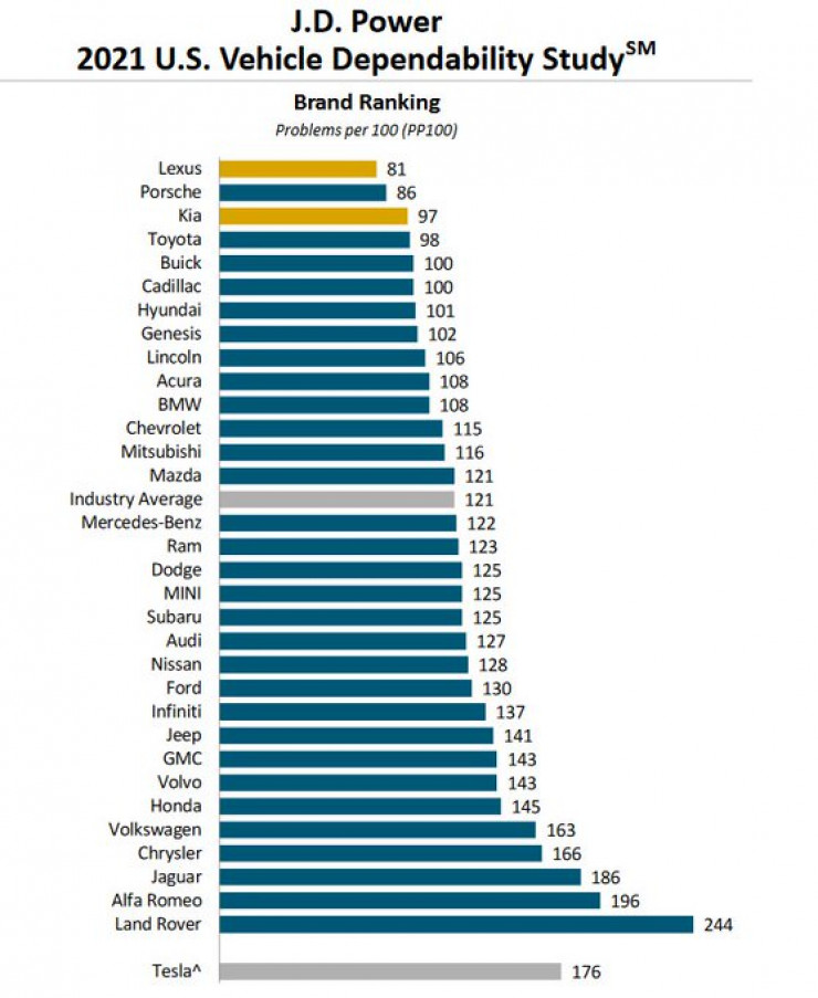 В этот раз в исследовании впервые принимали участие владельцы электрокаров Tesla, но в рейтинг эта компания вошла неофициально, поскольку не выдала J.D. Power разрешение на проведение опроса в 15 штатах США. В результате опросы провели в 35 других штатах, и по их результатам количество неисправностей машин Tesla составило 176 на 100 машин, это четвертый показатель с конца.