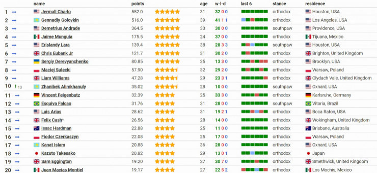 Алимханулы поднялся на 13 строчек и расположился на десятом месте. Второе место в среднем дивизионе занимает Геннадий Головкин, а лидирует американец Джермалл Чарло.