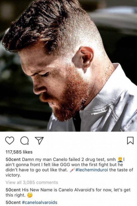 "Мой мужик "Канело" провалил два теста на допинг. Я не буду говорить, что я чувствовал, будто GGG выиграл первый бой, но он не должен был уходить вот так", - написал 50 Cent на своей странице в Instagram.