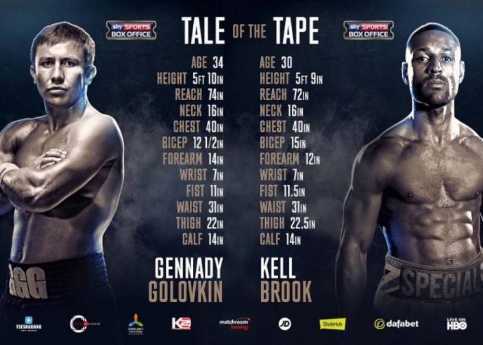 Напомним, накануне сайт BoxingScene представил сравнительную характеристику Головкина и Брука. Отмечается что у 34-летнего казахстанца по прозвищу GGG (Triple G) левосторонняя стойка, так же как и у его соперника The Special One (особенный). Рост Головкина - 179 сантиметров, а размах рук - 178 сантиметров. У Брука - 175 сантиметров и то и другое.