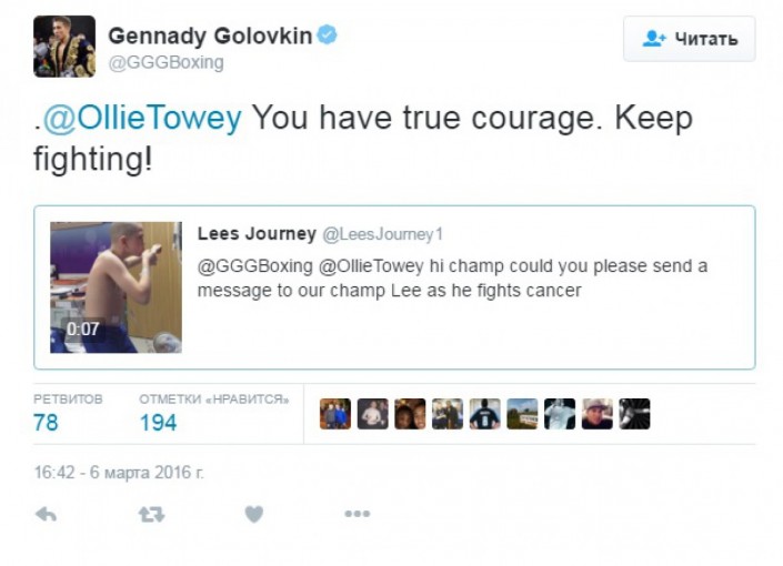 "У тебя есть мужество. Продолжай бороться!" - написал Головкин в Twitter.