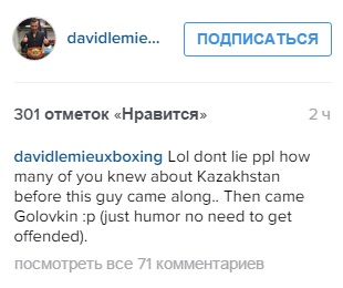 Публикацию он сопроводил подписью: "Народ, давайте не будем лгать, что вы знали о Казахстане, пока не появился этот парень (Борат)? Головкин пришел уже потом (просто юмор, не нужно обижаться)".