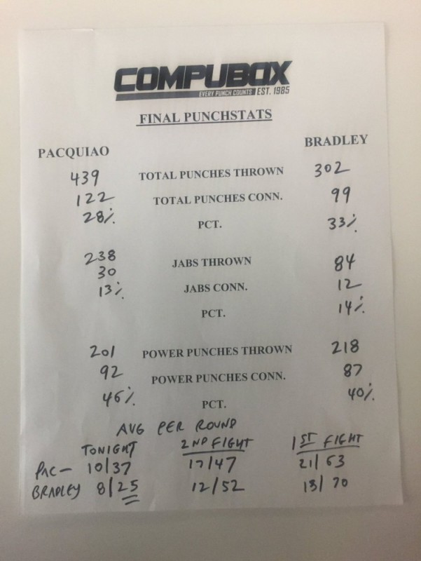 Согласно статистике ударов боя, Пакьяо выбросил 439 ударов (122 достигли своей цели), Брэдли выполнил на сто ударов меньше - 302 (99 достигли цели).