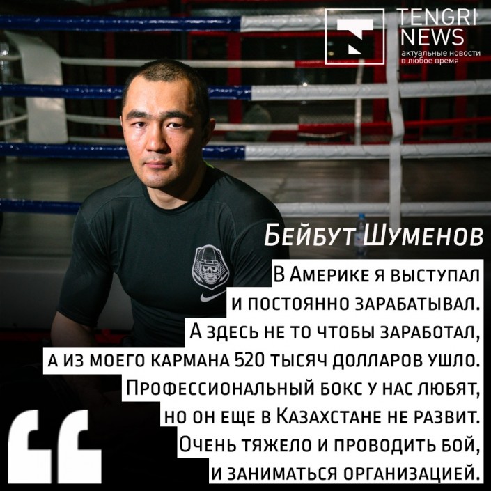 "В Америке я выступал и постоянно зарабатывал. А здесь не то чтобы заработал, а из своего кармана 520 тысяч долларов ушло. Спасибо акиму Астаны, который оказал финансовую поддержку. Могли бы и лучше вечер бокса провести. Профессиональный бокс у нас любят, но он еще в Казахстане не развит. Очень тяжело и проводить бой, и заниматься организацией", - сказал Шуменов на пресс-конференции в Астане.