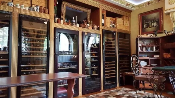 На первом этаже есть сауна (финская и русская бани), комната отдыха и ожидания для рабочего персонала, винный погреб, малый зал, кухонная зона, комнаты для персонала. На втором этаже находятся гостиная, занимающая 70 квадратных метров, три спальни и детская.