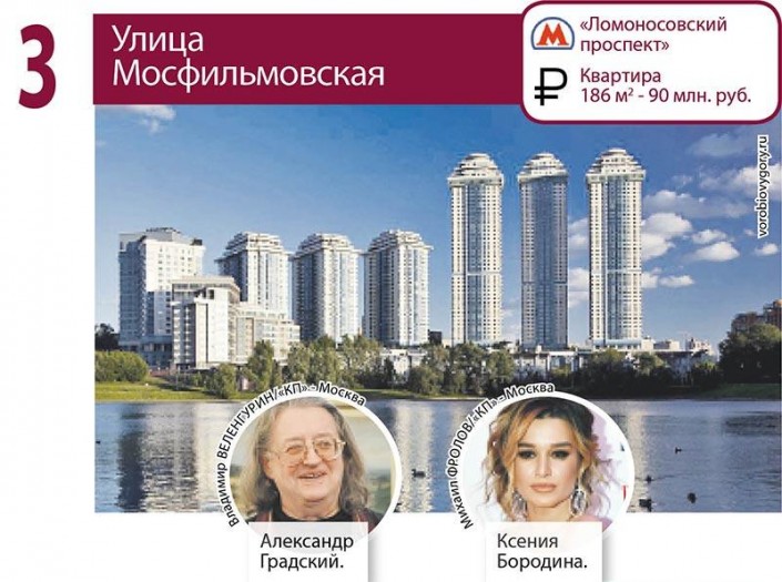 Неподалеку от студии "Мосфильм", на улице Мосфильмовская, обзавелись недвижимостью Сати Казанова, Анастасия Заворотнюк, Александр Градский, Михаил Кокшенов, Екатерина Архарова, Ксения Бородина.