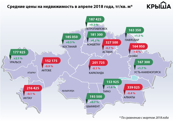 В Павлодаре и Усть-Каменогорске цены в апреле оказались выше, чем в марте, на 1,5 и 1,7 процента соответственно. Единица площади в этих городах сейчас оценивается в среднем в 163,4 и 167,3 тысячи тенге за квадратный метр.