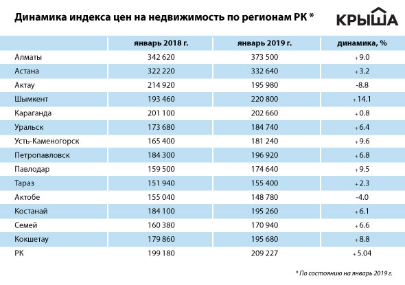 Относительно аналогичного периода 2018 года прирост средних цен предложений в РК составляет пять процентов. Наиболее яркие изменения произошли в Кокшетау (+8,8 процента), Алматы (+9 процентов), Павлодаре (+9,5 процента), Усть-Каменогорске (+9,6 процента) и Шымкенте (+14,1 процента).