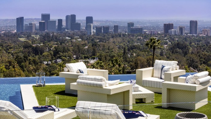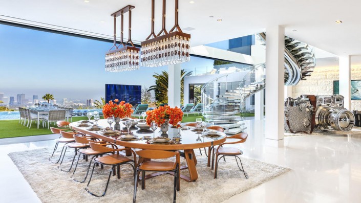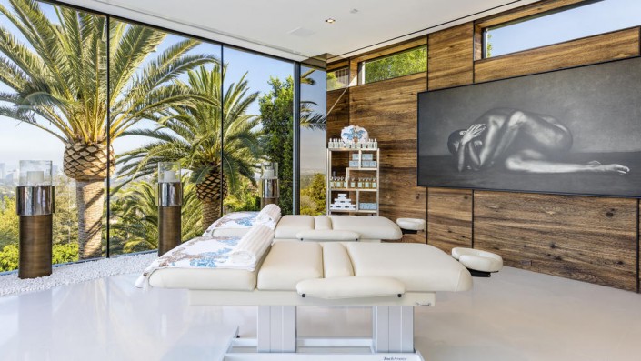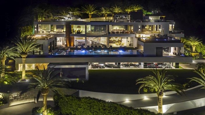 Площадь недвижимости, расположенной в элитном районе Бель-Эйр, составляет 3 530 квадратных метров. В доме 12 спален, 21 ванная комната, три кухни, боулинг, кинотеатр на 40 человек, 85-метровый бассейн с живописным видом и баром, спа, фитнесс-зал, два винных погреба, а также "конфетная комната", заполненная сладостями на 200 тысяч долларов. Особняк украшен 130 произведениями искусства.