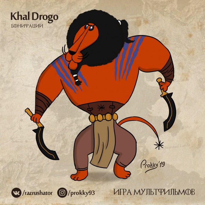 Художник изобразил Зайца и Волка из "Ну, погоди!" в образах Арьи Старк и Сандора Клигана, Малыш и Карлсон из одноименного мультфильма превратились в Джоффри Баратеона и Тириона Ланнистера, Винни Пух стал Сэмвеллом Тарли, Пятачок - Джоном Сноу. Чебурашка в исполнении автора примерил на себя роль Дейенерис Таргариен с драконом-Геной.