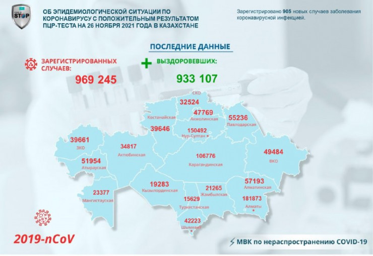 За прошедшие сутки (26 ноября) в Казахстане зарегистрировано 905 новых случаев заболевания коронавирусной инфекцией, передает Tengrinews.kz со ссылкой на данные Межведомственной комиссии по нераспространению COVID-19.