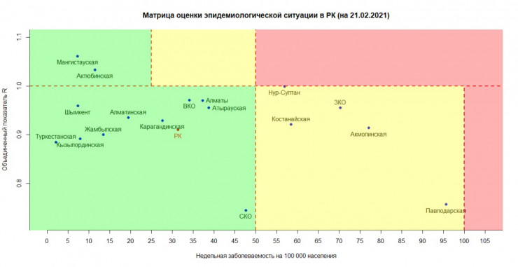 Напомним, согласно матрице оценки эпидемиологической ситуации, в регионах Казахстана на 20 февраля 2021 года ни один регион не остался в "красной" зоне по распространению коронавируса