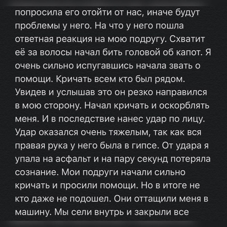 Затем агрессор переключился на Алину. Он нанес ей удар по лицу. "Удар оказался очень тяжелым, так как рука у него была в гипсе. Я упала на асфальт и на пару секунд потеряла сознание. Подруга стала кричать о помощи, но никто не подошел. Они оттащили меня в машину и закрылись", - вспоминает пострадавшая.