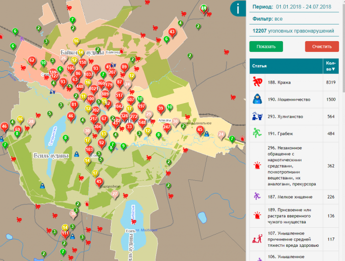 В столице Казахстана с начала года было совершено более 12 тысяч уголовных правонарушений. Согласно данным Карты преступности в Астане с 1 января было совершено 24 убийства. Один трагичный случай произошел в день рождения столицы, 6 июля, в центре левого берега.
