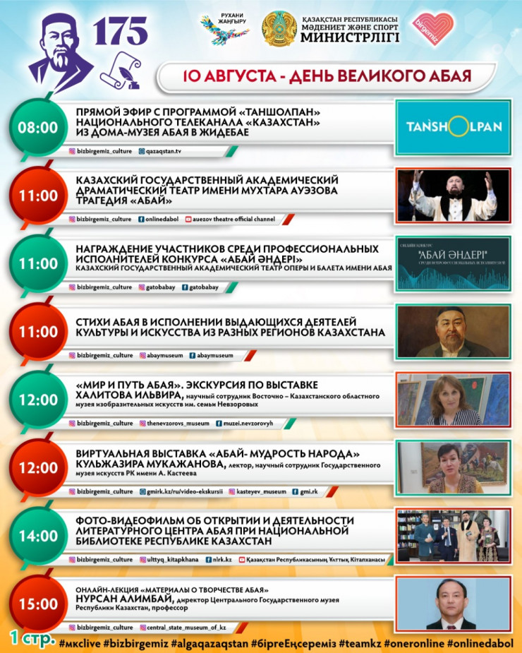 В этом году исполняется 175 лет со дня рождения Абая Кунанбаева. 10 августа был объявлен Днем Абая, дата была внесена в официальный перечень праздников.