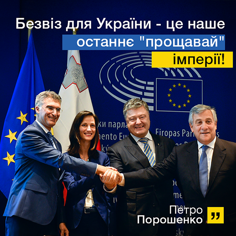 Порошенко также опубликовал фотографию в Twitter и Facebook, сделанную в момент подписания договора. "Безвиз для Украины - это наше последнее "прощай" империи!" - гласит надпись на снимке.