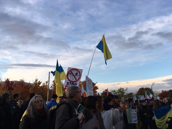 Президента России Владимира Путина, прилетевшего вечером 19 октября в Берлин на "Нормандские переговоры", встретила группа протестующих с украинскими и сирийскими флагами. В руках они держали плакаты: "Путин, хватит бомбить Сирию", "Стоп, Путин", "Путин-террорист". Об этом сообщает Tengrinews.kz.