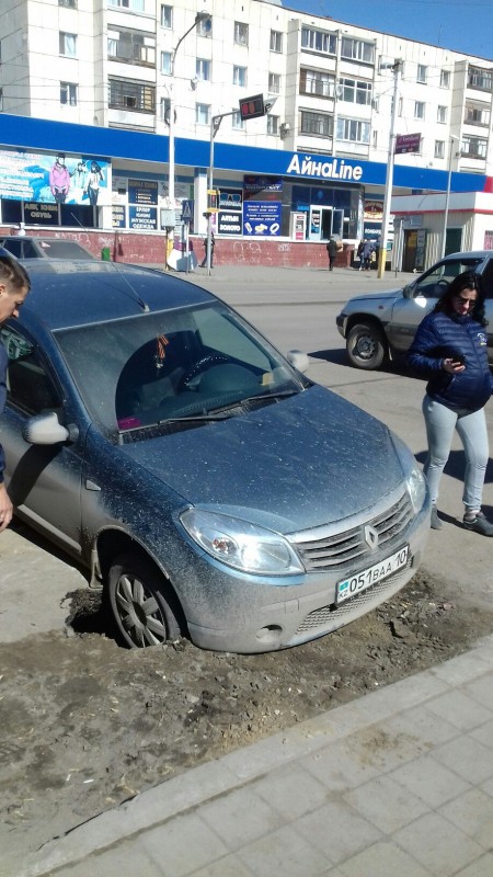 Асфальт провалился под автомобилем в Костанае Фото kstnews.kz