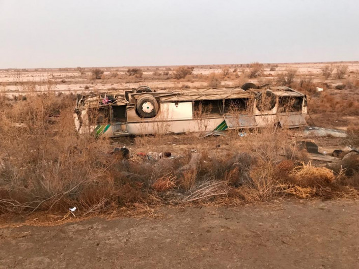 Авария на трассе Кызылорда - Кумколь произошла 3 декабря в 5.25. В салоне находились 35 пассажиров. Ранее сообщалось о четырех погибших.