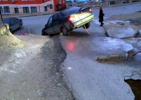 В Актау обвалилась часть проезжей части, сообщает Lada.kz. В образовавшуюся яму угодил автомобиль.