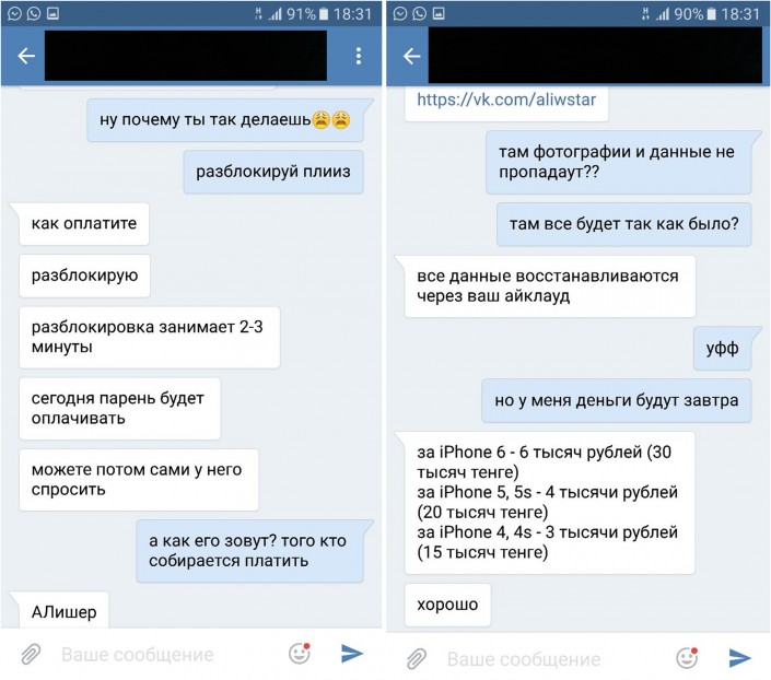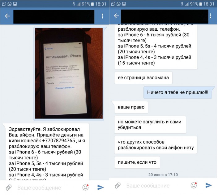 "Предположительная схема такова: в социальной сети "В Контакте" в одной из групп происходит взлом личной страницы одного из знакомых потерпевшего. Далее с этого адресата потенциальной жертве приходит сообщение с просьбой оказать содействие в поиске его сотового телефона iPhone через определенную программу. Таким образом, злоумышленник обманным путем завладевает персональными данными сотового телефона потерпевшего, после чего блокирует его и в дальнейшем вступает с ним в переписку, где предлагает заплатить ему за разблокировку сотового телефона. В ходе переписки мошенник присылает полную инструкцию, то есть, так называемую, тарифную сетку со стоимостью разблокирования мобильного телефона в зависти от модели. Также указывается, что оплату необходимо произвести через электронную платежную систему QIWI", - рассказал о методах мошеннического промысла начальник отдела "К" Управления криминальной полиции ДВД Алматы подполковник полиции Аскар Сысоев.