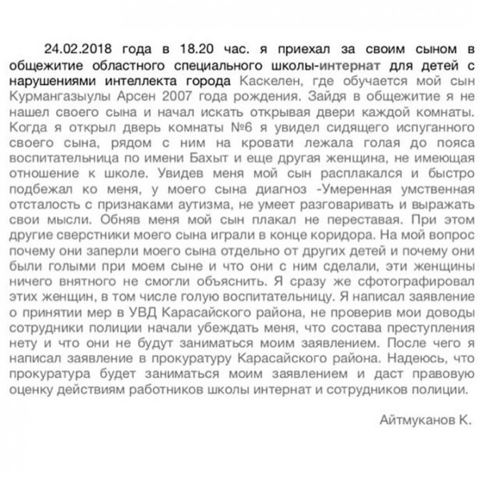 "Когда я открыл дверь комнаты № 6, я увидел сидящего испуганного своего сына, рядом с ним на кровати лежала голая до пояса воспитательница по имени Бахыт и еще другая женщина, не имеющая отношения к школе", - рассказал мужчина.