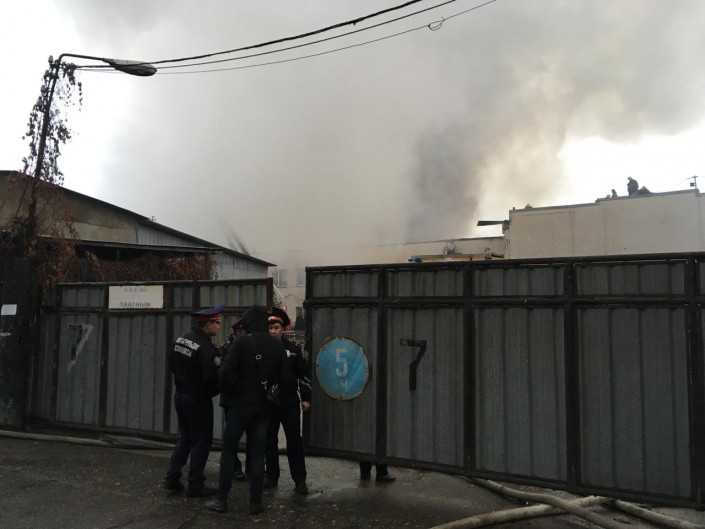 Сотрудник одного из офисов, расположенных близ горевших складов, сообщил, что склады охраняются.