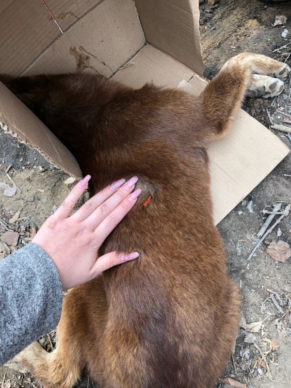 Фотографии и видео пострадавших животных карагандинцы размещают в социальных сетях. На снимках запечатлен щенок, из спины которого торчит смертельный дротик. По словам горожан, погибшее животное обитало вместе с мамой и другими щенятами на автостоянке.