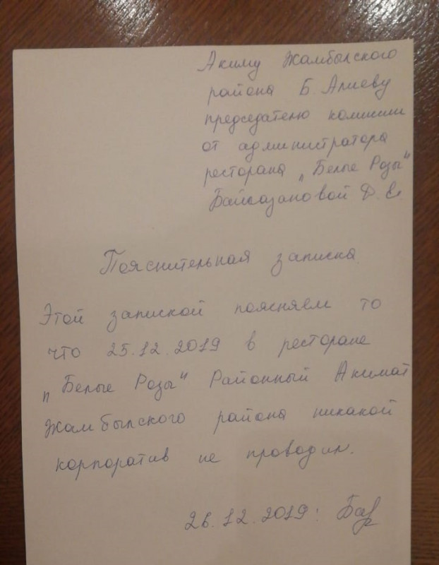 Как следует из пояснительной записки администратора ресторана, в тот вечер акимат не проводил корпоратив.