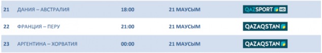 В 18.00 по времени Астаны в Самаре состоится матч группы С между сборными Дании и Австралии. Эту встречу в прямом эфире покажет телеканал QazSport. Онлайн-трансляция.